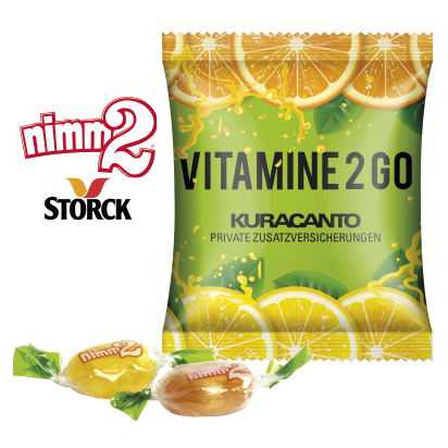 2 bonbons durs aromatisés aux fruits avec une garniture savoureuse et des vitamines.